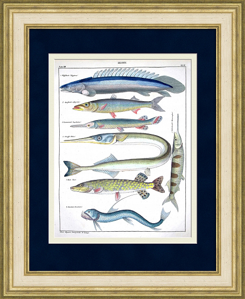 Щукообразные рыбы: многопер, барракуда, щука, сарган. Редкая гравюра