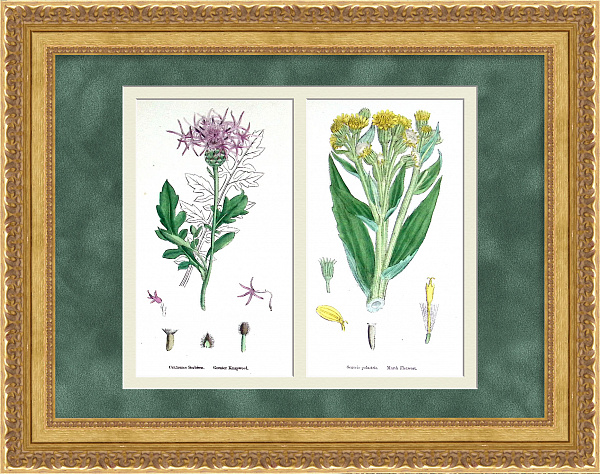 Ботаника, семейство Астровые: василек и пепельник болотный. Старинная гравюра