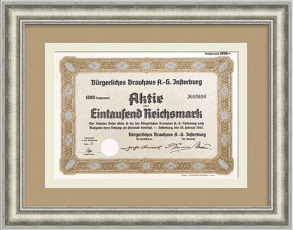 Городская пивоварня Инстербурга. Акция на 1000 рейхсмарок 1942 года