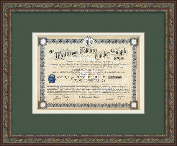Акционерное общество Компании по снабжению табаком и спичками. Антикварная акция в 1 фунт стерлингов 1924 года
