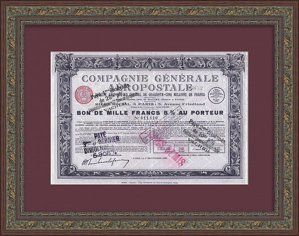 Французская авиакомпания «Аэропосталь». Старинный бон на 1000 франков под 5 % на предъявителя 1930 года
