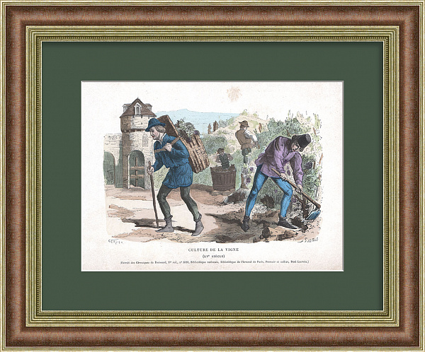 Виноградарство и виноделие в средневековой Франции. Старинная гравюра