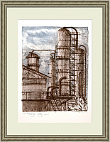 На нефтеперерабатывающем заводе: Установка перегонки нефти. Большая, старинная гравюра