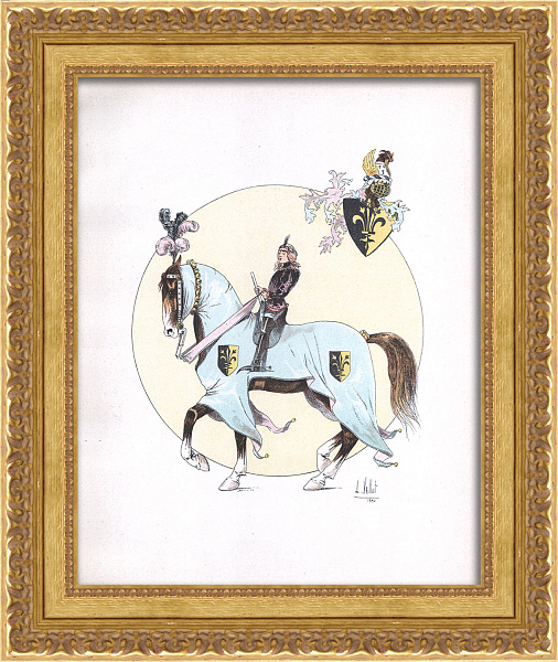 Паж на коне: въезд участников рыцарского турнира. Старинная гравюра 19 века