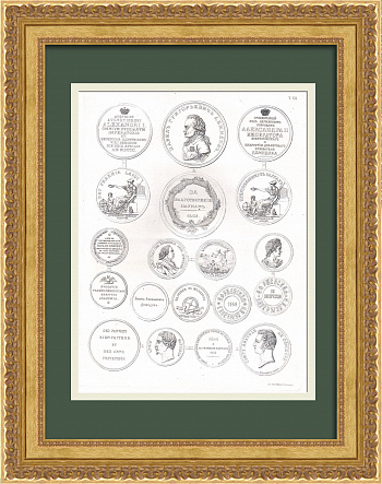 Старинная гравюра посвящена многообразию наград Российской империи. Антикварная гравюра изображает награды за заслуги в науке, торговле и искусстве: премия Императорской академии художеств «За экспрессию», памятная медаль в честь Прокофия Акинфиевича Демидова и др.