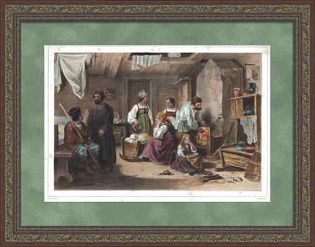 Редкая антикварная гравюра изображает жизнь русских крестьян. Старинная гравюра иллюстрирует устройство русской избы и крестьянский быт. Антикварная гравюра относится к правлению Николая I и являлась частью атласа «Путешествия по Скандинавии, Лапландии, Шпицбергену и Фарерским островам в 1838, 1839 и 1840 годах на корвете».