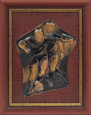Винтажное панно, посвященное футболу, представляет собой медный барельеф, запечатлевший противостояние двух спортсменов. Футболисты в динамичной позе ведут борьбу за владение мячом.